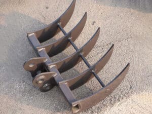 A small excavator rake is a versatile attachment used for clearing debris, leveling